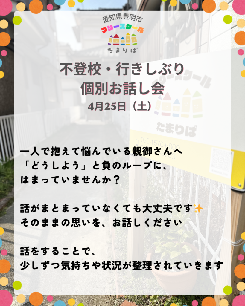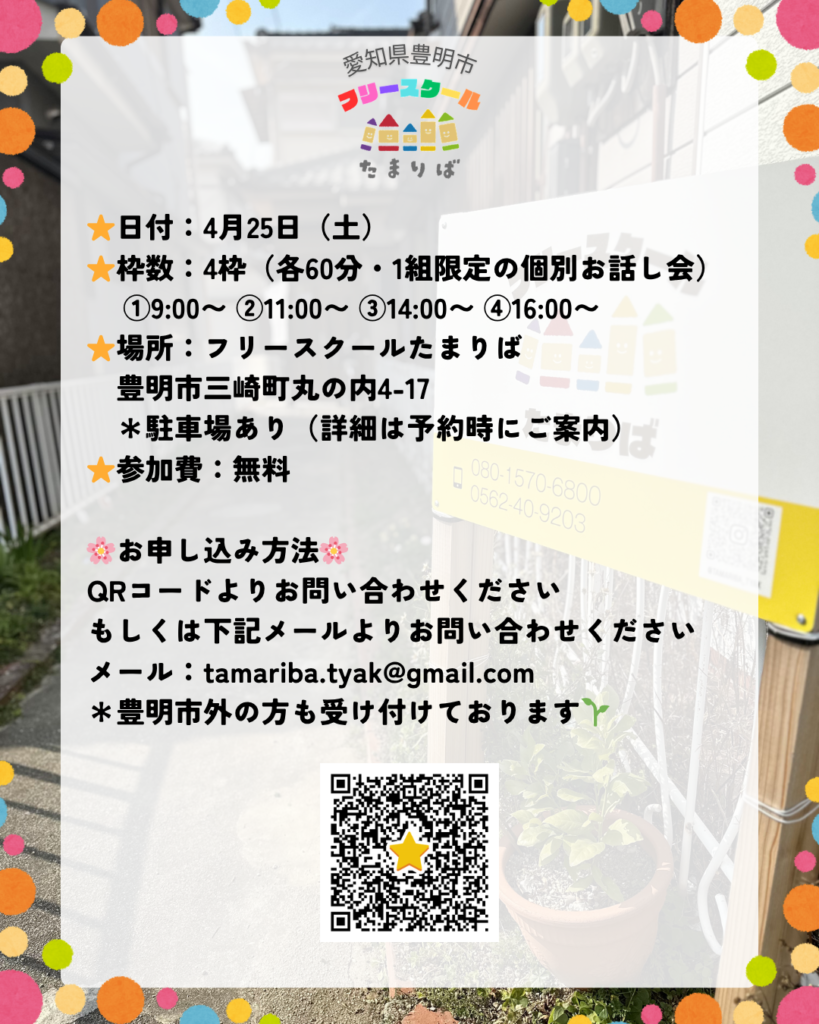 4月25日(土)個別お話し会のお知らせ Uncategorized 2026.03.31 4月25日(土曜日)個別お話し会を開催します。一人で抱えて悩んでいる親御さんへ「どうしよう」と負のループに、はまっていませんか? 話がまとまっていなくても大丈夫です✨そのままの思いを、お話しください 話をすることで、少しずつ気持ちや状況が整理されていきます 下記またはQRコードよりお申し込みください。https://forms.gle/pQMvp6ga4EQTqx9T6